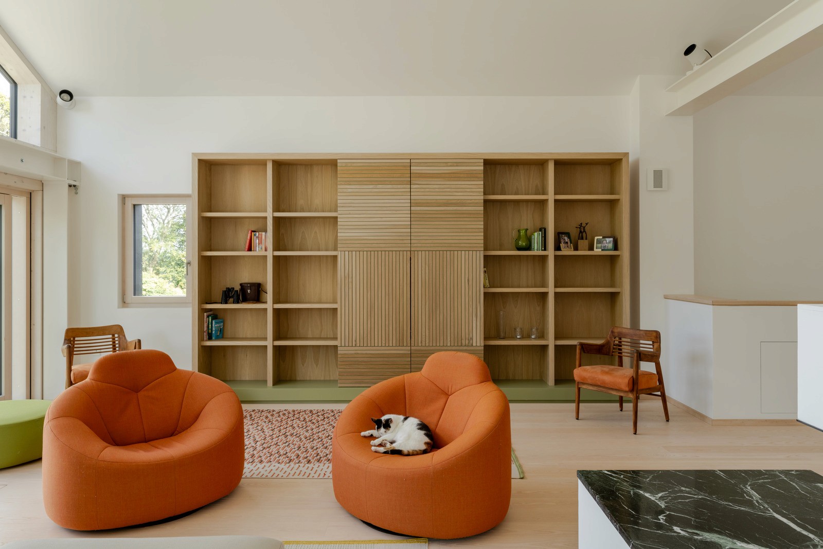 As the site descends from rear to street, the house progressively anchors itself into the terrain. Green Hill House is articulated through a robust material palette arranged in clear, legible volumes, tempering the rugged qualities of the surrounding environment while aligning with them through muted greys and warm, earthen tones. Concrete masonry walls lend solidity and definition, establishing the building’s perimeter and allowing the roof form to extend lightly above. Conceived as an extension of the internal living spaces, the courtyard remains constantly present through expansive glazing, reinforcing visual continuity and connection throughout the home.